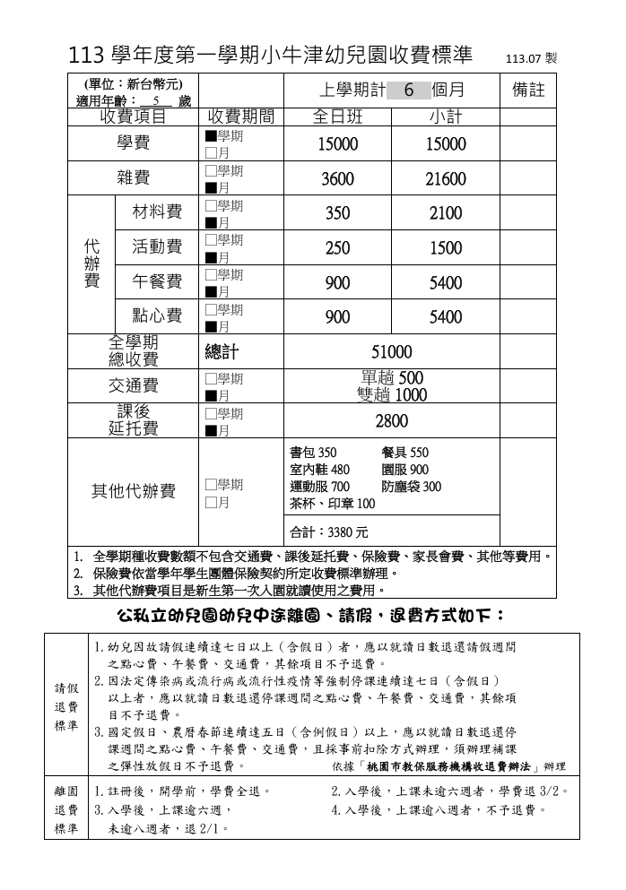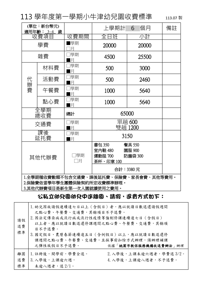 113學年度第一學期小牛津幼兒園收費標準